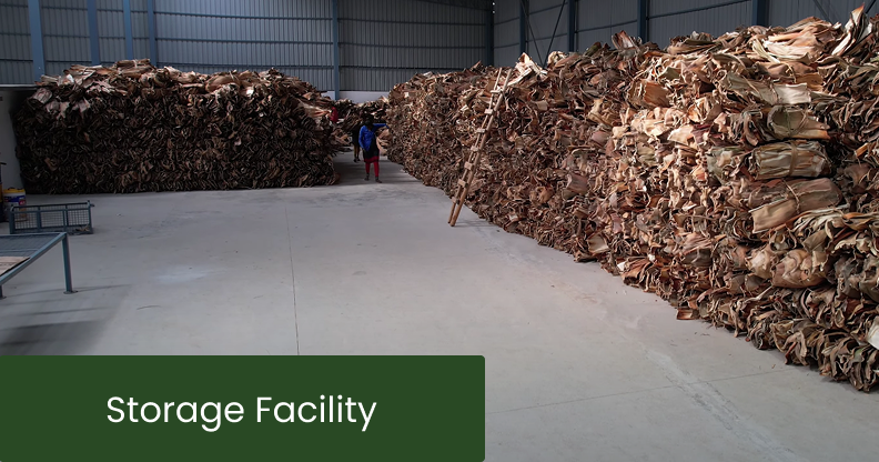 Areca sheaths are then stored in a dry facility for further processing.