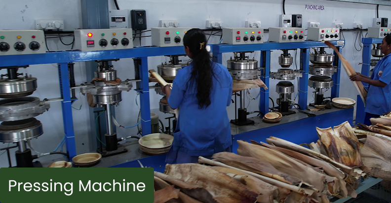 Sanitized leaves are pressed using hydraulic machines, each with dedicated molds for different shapes and sizes.
