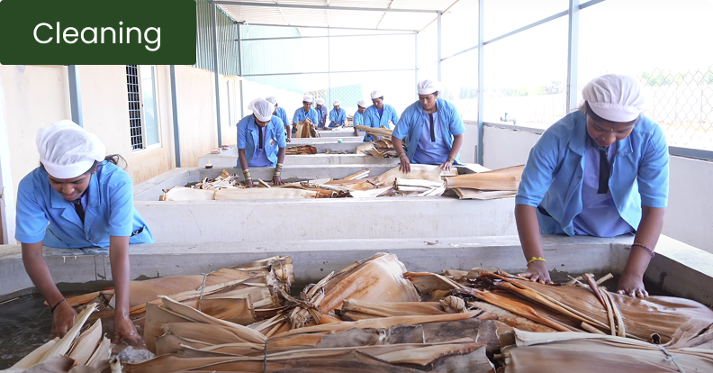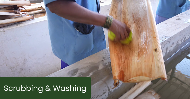 The sheaths are then scrubbed with clean water to remove dirt without using chemicals.